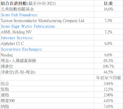 本週科技股稍為轉強,接力推升大市,傳統產業股稍轉弱,拜登公怖了2.3兆基建開支及加稅計劃,為大市掃清陰霾,倉位逐漸增加至60%,組合配置了新舊產業。回顧過去一個月,做得最錯的是價位529沽出了艾思摩爾。